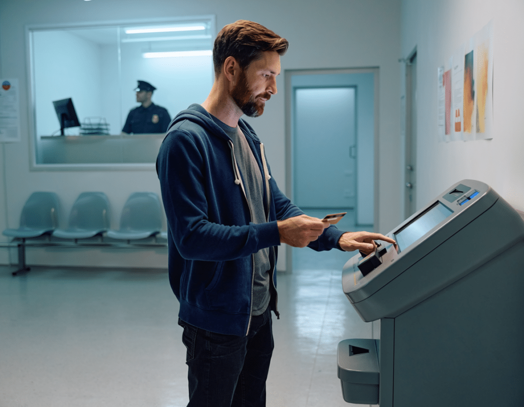In many corrections deployments, biometric enrollment happens at intake. Fingerprints or iris scans are captured and tied to the individual’s facility record. When that person is released and approaches a kiosk to receive funds, the verification step is biometric-first: the kiosk reads a fingerprint or iris scan and matches it to the enrollment record, bypassing the need for a government ID entirely.